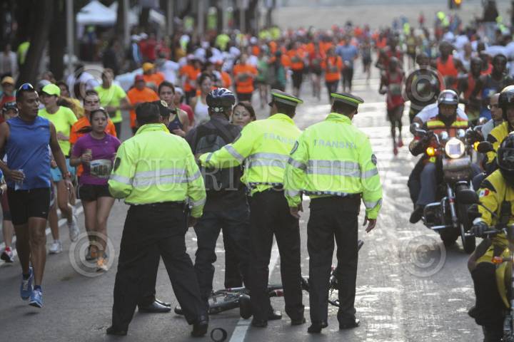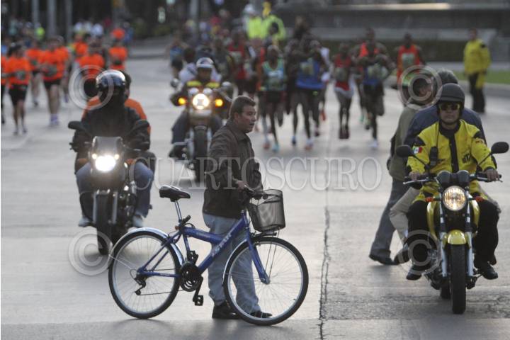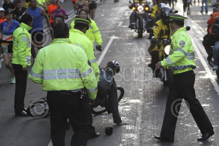 MÉXICO D.F., 02SEPTIEMBRE2012.- Un reportero gráfico es detenido por elementos de la secretaria de Seguridad Publica del D.F., al realizar su trabajo en su bicicleta durante la cobertura del XXX Maratón Internacional de la Ciudad de México. FOTO: GUILLERMO PEREA /CUARTOSCURO.COM