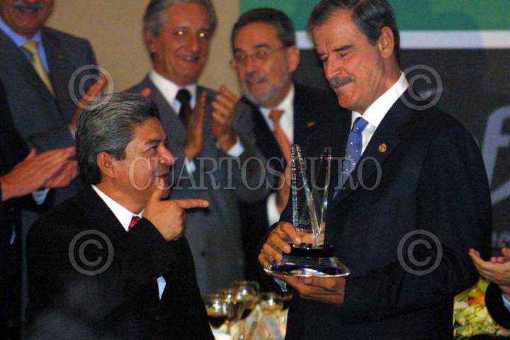 MONTERREY, NUEVO LEON, 26NOVIEMBRE2004.- El presidente de México, Vicente Fox recibe un premio por parte de los empresarios asistentes a la XXXII Convención Nacional IMEF 2004, evento realizado en el salón Nuevo León del Hotel Crowne Plaza de esta ciudad. FOTO: Jorge López/CUARTOSCURO.COM