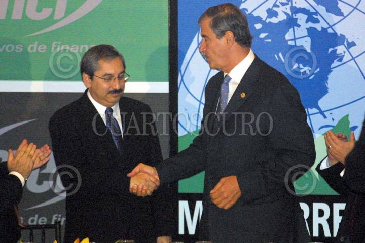 MONTERREY, NUEVO LEON, 26NOVIEMBRE2004.- Natividad González Parás, Gobernador de Nuevo León y Vicente Fox, Presidente de la República se saludan al inicio de la XXXII Convención Nacional IMEF 2004, evento realizado en el salón Nuevo León del Hotel Crowne Plaza de esta ciudad. FOTO: Jorge López/CUARTOSCURO.COM