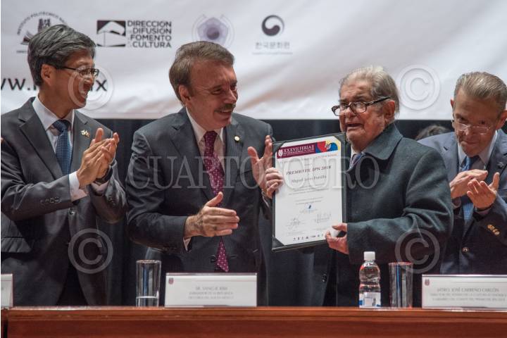 CIUDAD DE MÉXICO, 31AGOSTO2018.- Enrique Graue Wiechers, rector de la Universidad Nacional Autónoma de México (UNAM); Mario Alberto Rodríguez Casas, director general del Instituto Politécnico Nacional (IPN); y los doctores: Miguel León Portilla, y Pablo Rodomó Zevnovaty, encabezaron la ceremonia de inauguración de la XXXVII Feria Internacional del Libro del IPN. Miguel León Portilla recibió el Premio FIL-IPN en la categoría humanística, mientras que Pablo Rodomó en la categoría científica, como reconocimiento a sus destacadas trayectorias. FOTO: MARIO JASSO /CUARTOSCURO.COM