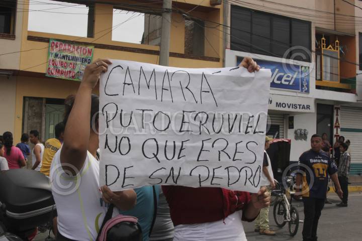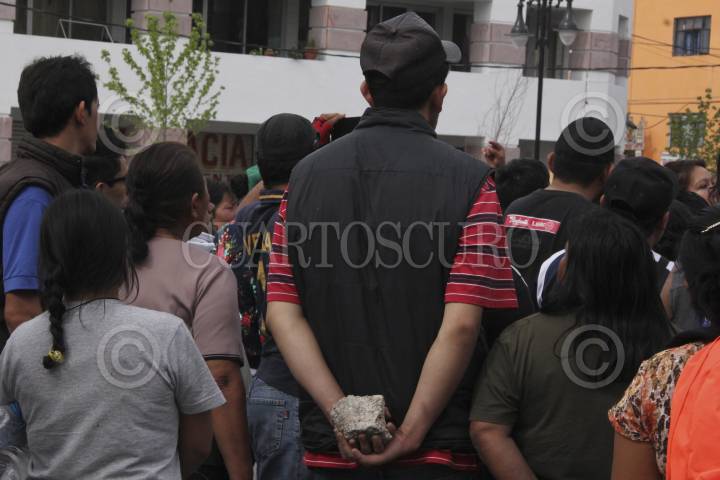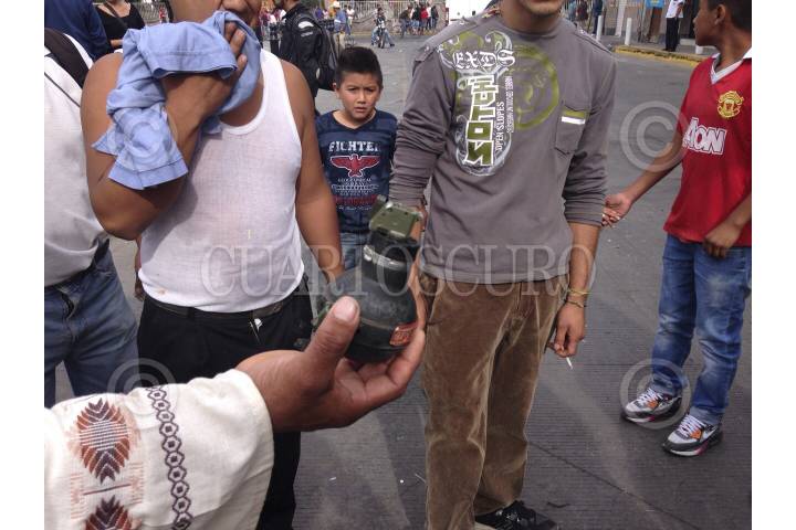 ECATEPEC, ESTADO DE MÉXICO, 27ABRIL2015.- Dos personas detenidas por bloquear la carretera México Pachuca derivó en un enfrentamiento entre pobladores de San Pedro Xalostoc contra Granaderos y Policías Municipales, al exigir la liberación del Presidente de la colonia y una persona mas, intentaron quemar patrullas, reteniendo a un Policia, sobre la calle Benito Juárez quemaron llantas, Granaderos arribaron a la explanada de la colonia y con gas lacrimógeno esparcieron a la multitud quienes respondía con piedras y botellas hacia los uniformados que tiraban los gases para replegarlos , lesionando a una persona en el rostro que solo pasaba por el lugar, al rescatar a sus compañeros se retiraron del lugar. FOTO: DIEGO REYES /CUARTOSCURO.COM