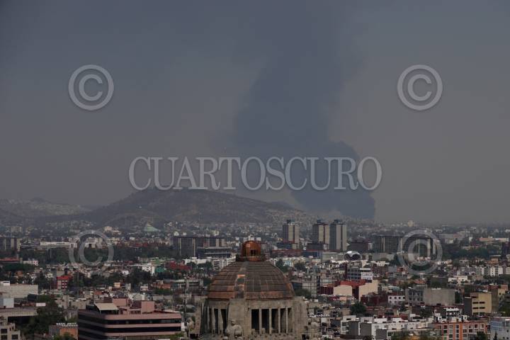 Vista del incendio de la fábrica de plástico en Xalostoc, desde el Senado de la República
