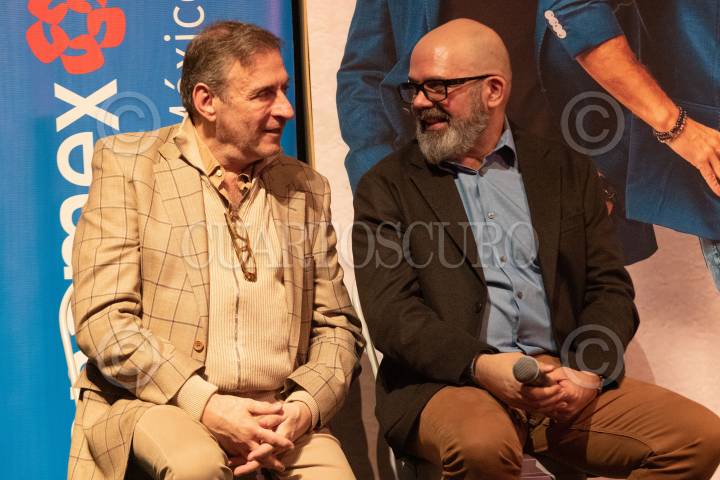Los productores teatrales Morris Gilbert y Xavier López Miranda durante la conferencia de la obra "La Clase".