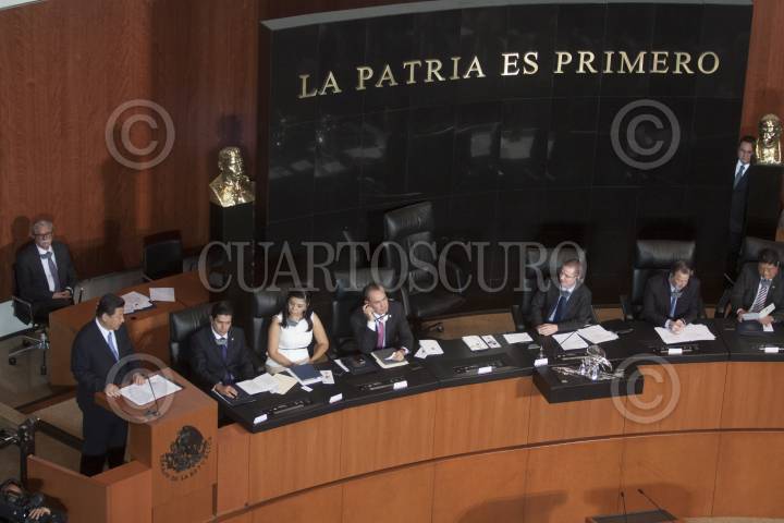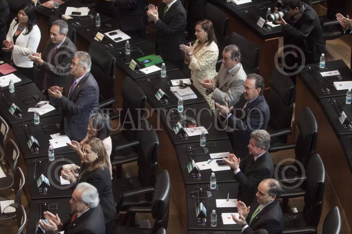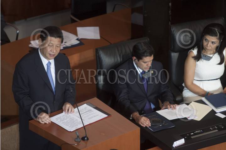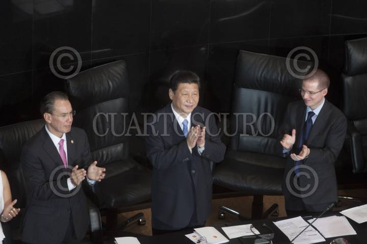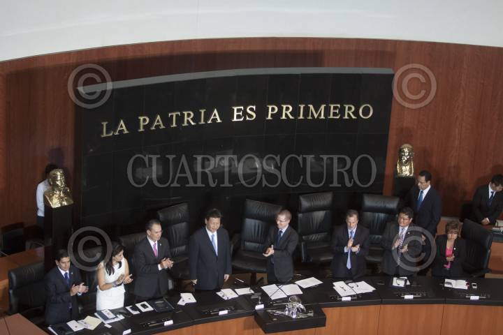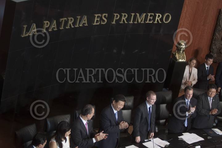 MÉXICO, D.F., 05JUNIO2013.- El Presidente de la República China Xi Jinping visitó el Senado de la República como parte de su visita de estado, el dirigente chino recorrió parte de una exposición que se monto en la explanada de la sede de la Cámara Alta. En la imagen los senadores del PRI le aplauden de pie al mandatario asiático. FOTO: MOISÉS PABLO /CUARTOSCURO.COM