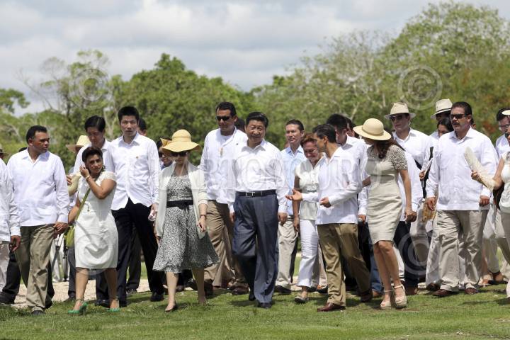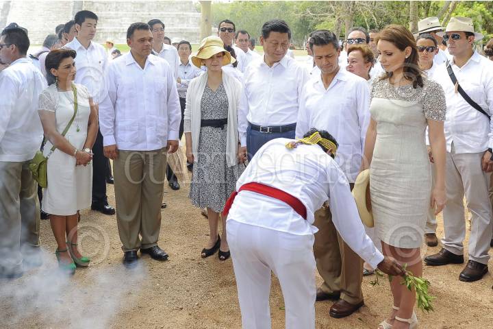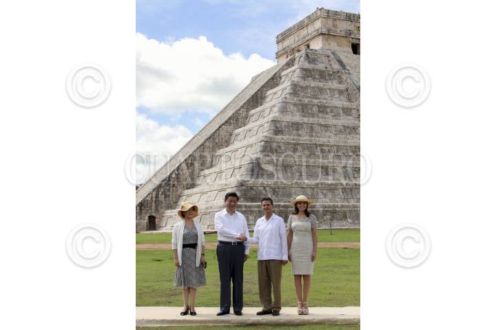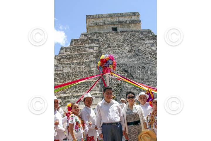CHICHEN ITZA, YUCATAN, 06JUNIO2013.- Xi Jinping, presidente de la República Popular China, en compañía de su esposa Peng liyuan, recorrió la zona arqueológica de Chichén Itzá durante la última jornada de visita a México como parte de su primera gira por el continente americano con el que busca ahondar su relación en distintas áreas, incluido el turismo. Acompañado del presidente Enrique Peña Nieto y su esposa Angélica Rivera, Xi presenció una ceremonia indígena de bailes y ritmos de instrumentos musicales en las inmediaciones de la zona localizada en el estado de Yucatán. FOTO: CS PHOTO /CUARTOSCURO.COM