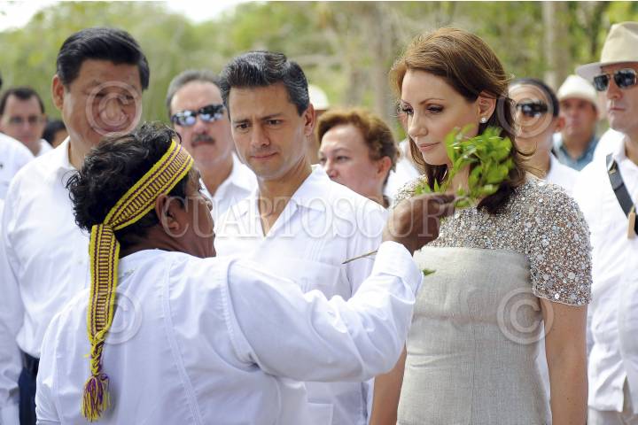 CHICHEN ITZA, YUCATAN, 06JUNIO2013.- La primera dama Angelica Rivera de Peña recibió una limpia-ritual durante el recorrido que realizó en compañía de su esposa el Presidente de México Enrique Peña Nieto por el sitio arqueológico Chichen Itza, esto en el marco de la visita de estado del Presidente de la República China Xi Jinping. FOTO: FRANCISCO BALDERAS /CUARTOSCURO.COM