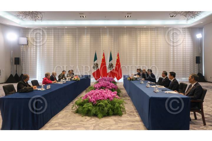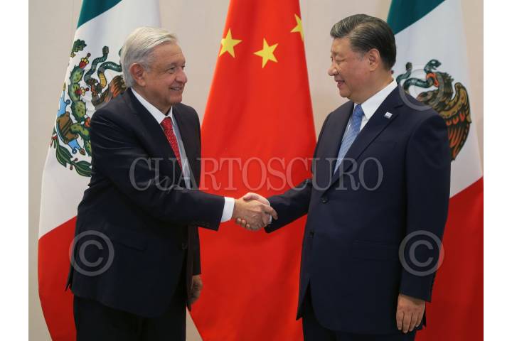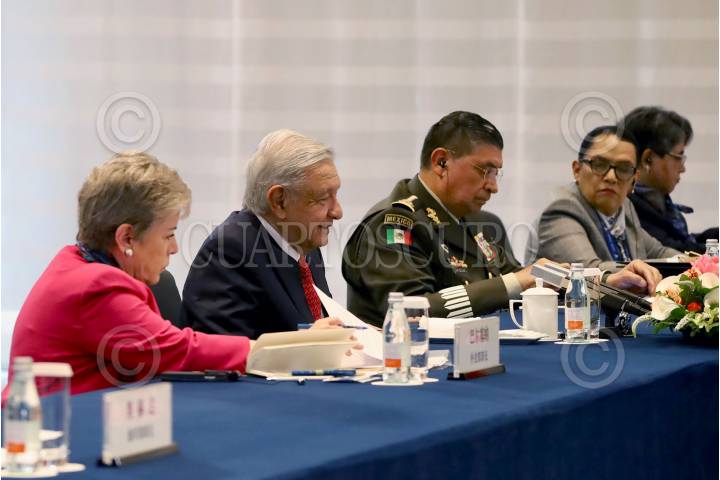 SAN FRANCISCO, CALIFORNIA, ESTADOS UNIDOS, 16NOVIEMBRE2023.- Andrés Manuel López Obrador, Presidente de México, durante su participación en la reunión bilateral con su homólogo de la República Popular China, Xi Jinping. Lo anterior, en compañía de: Alicia Bárcena Ibarra, secretaria de Relaciones Exteriores; Luis Cresencio Sandoval González, secretario de la Defensa Nacional; José Rafael Ojeda Durán, secretario de Marina; Raquel Buenrostro Sánchez, secretaria de Economía; Rosa Icela Rodríguez Velázquez, secretaria de Seguridad y Protección Ciudadana. Por parte de la República Popular China: Wang Yi, ministro de Relaciones Exteriores; Lan Fo’an, ministro de Finanzas; Wang Wentao, ministro de Comercio; Zheng Shanjie, presidente de la Comisión Nacional de Desarrollo y Reforma (CNDR); Jiang Jinquan, director de la Oficina de Investigación Política del Partido Comunista; Cai Qi, miembro del Comité Permanente del Buró Político del Partido Comunista y Ma Zhaoxu, viceministro de Relaciones Exteriores. FOTO: PRESIDENCIA/CUARTOSCURO.COM