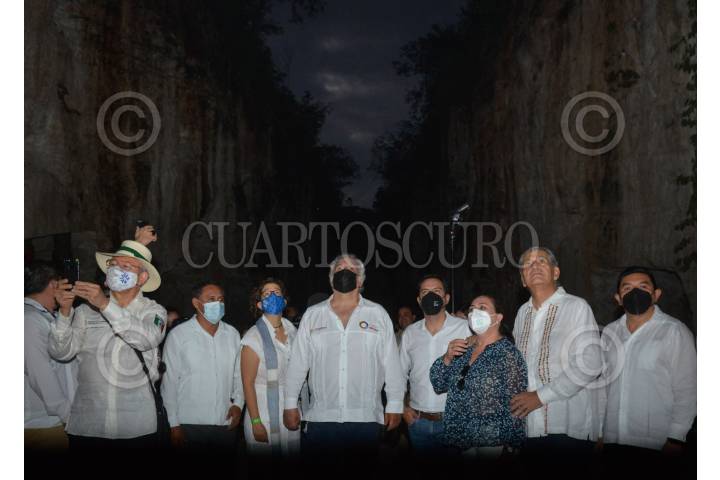 Mauricio Vila Dosal, gobernaron de Yucatán, y Miguel Torruco, secretario de Turismo Federal, durante el recorrido del proyecto turístico "Aldea Maya" ubicado en la reserva Xibalbá la cual comprende venta de artesanías, Casa Jade, y en la Iglesia Armón, que pretende ser inaugurado el verano de 2022.