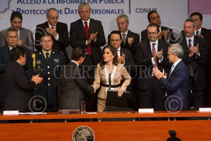 MÉXICO, D.F., 23JUNIO2015.- Ximena Puente de la Mora, comisionada presidente del Instituto de Transparencia, Acceso a la Información y Protección de Datos Personales, Enrique Peña Nieto, Presidente de México y Miguel Ángel Mancera, Jefe de Gobierno, durante la instalación del Consejo del Sistema Nacional de Transparencia, Acceso a la Información y Protección de Datos Personales, en evento realizado en el WTC. FOTO: MOISÉS PABLO /CUARTOSCURO.COM