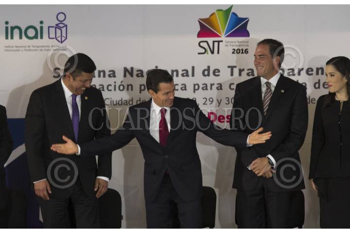 CIUDAD DE MÉXICO, 28SEPTIEMBRE2016.- Edmundo Javier Bolaños, presidente de la mesa directiva de la Cámara de Diputados; Enrique Peña Nieto, Presidente de México; Pablo Escudero, presidente del Senado, y Ximena Puente de la Mora, presidenta del INAI, durante la semana nacional de transparencia 2016, organizado por el Instituto Nacional de Transparencia, Acceso a la Información y Protección de Datos Personales (INAI). FOTO: MOISÉS PABLO /CUARTOSCURO.COM