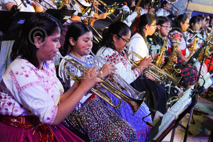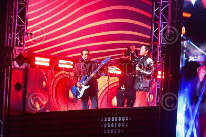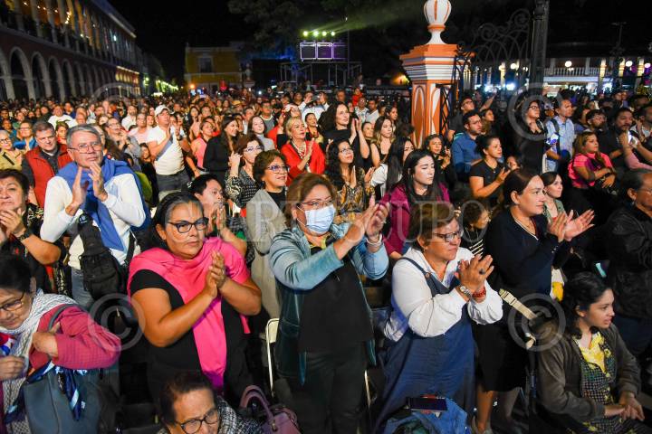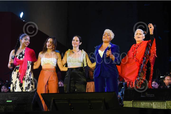 CAMPECHE, CAMPECHE, 16DICIEMBRE2024.- La Cantante Ximena Sariñana, acompañada por la banda femenil regional Mujeres del Viento Florido, cerró con broche de oro el Festival del Centro Histórico en Campeche, cautivando al público con una presentación inolvidable. En el escenario se unieron las voces de Catalina García de Monsieur Periné , Eugenia León, Haila Mompié y Lucia Gutiérrez. FOTO: MICHAEL BALAM/CUARTOSCURO.COM