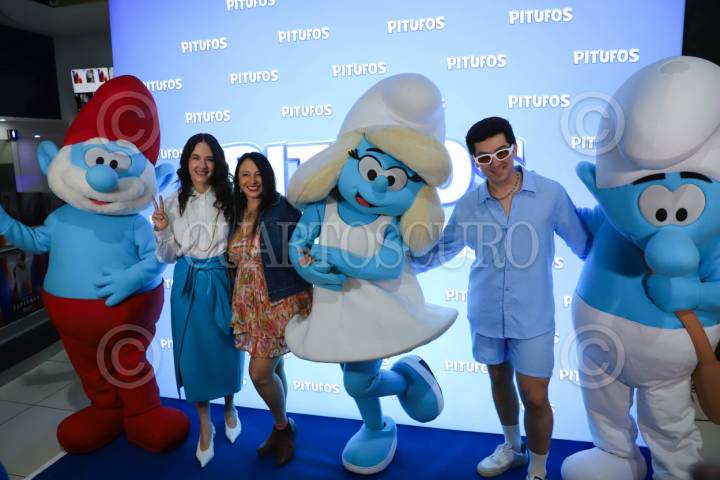 CIUDAD DE MÉXICO, 13JULIO2025.- Los actores Ximena Sariñana, Cristina Hernández y Jerry Velázquez acompañados de botargas de los personajes de los Pitufos durante el Photocall realizado en Cinépolis Perisur.