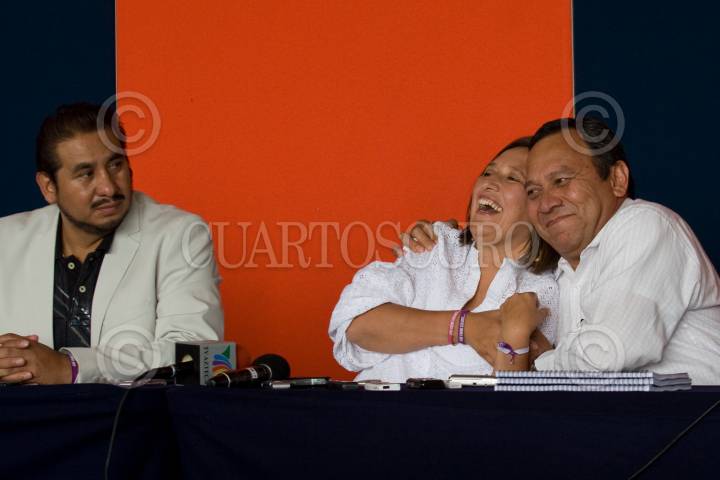 PACHUCA, HIDALGO 05JULIO2010.- Xóchilt Gálvez, candidata a la gobernatura por la coalición “Hidalgo Nos Une” acompañada de Arturo Aparicio, dirigente estatal del PT y de Jesús Zambrano, Diputado del PRD, dio a conocer que impugnara los resultados de la elección. FOTO: GUILLERMO PEREA/CUARTOSCURO.COM