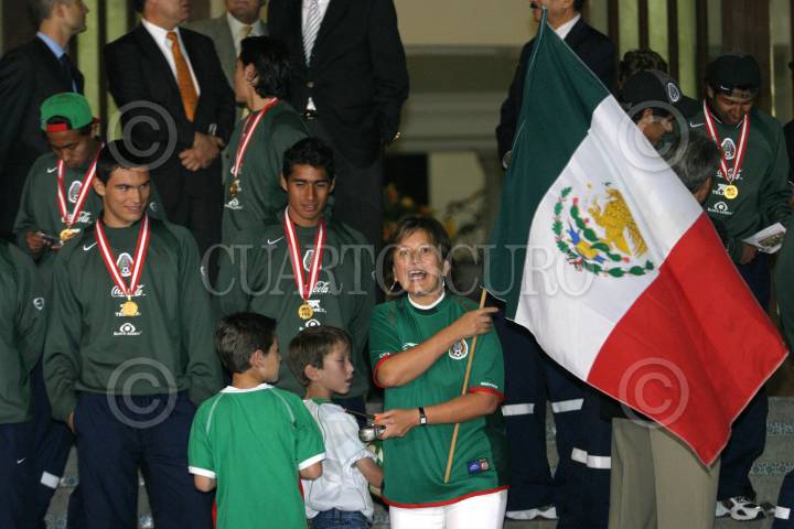 MEXICO, D.F. 03OCTUBRE2005.- Xochilt Galvez, secretaria de asuntos indigenas, festeja con integrantes la Sub-17 su triunfo como campeones Mundiales de la especialidad. FOTO: Nelly Salas/CUARTOSCURO.COM
