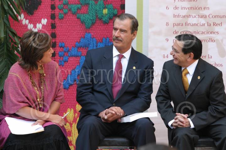 MEXICO, D.F., 05ABRIL2006.- Xochilt Galvez Ruíz, Directora General de la Comisión Nacional para el Desarrollo de los Pueblos Indgenas, Vicente Fox, Presidente de la República y Jorge Carlos Hurtado, gobernador de Campeche, durante el informe de la Segunda Semana Indigena en el patio central del Palacio Nacional. FOTO: Moisés Pablo/CUARTOSCURO.COM