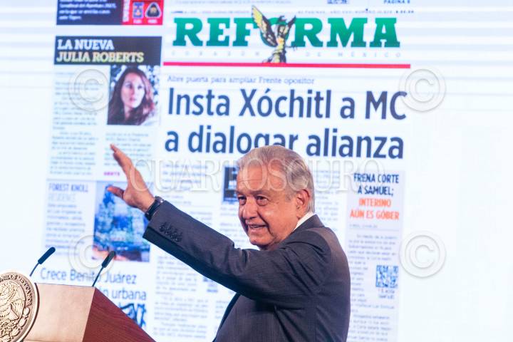 CIUDAD DE MÉXICO, 04DICIEMBRE2023.- Andrés Manuel López Obrador, Presidente de México, muestra una portada del periódico Reforma (la cual lleva de ocho columnas que Xóchitl Gálvez llama a MC a dialogar alianza), al momento de estar hablando del conflicto constitucional sobre quién es el actual gobernador de Nuevo León, esto luego de que el gobernador Samuel García de Movimiento Ciudadano dejara su cargo para buscar la candidatura presidencial de ese partido. FOTO: MOISÉS PABLO/CUARTOSCURO.COM