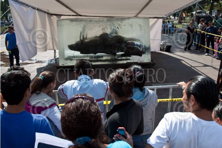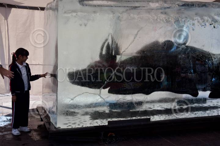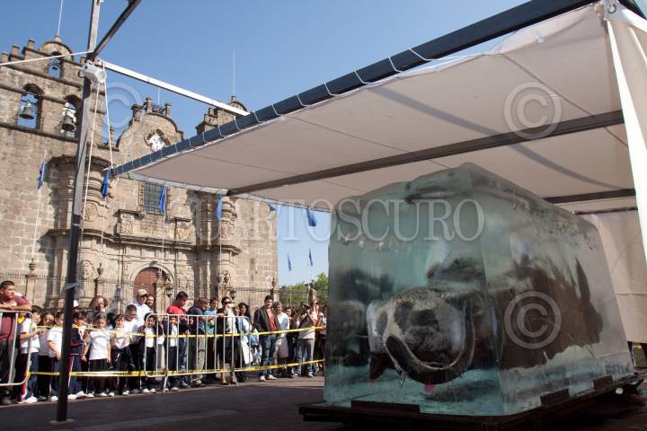 GUADALAJARA, JALISCO, 24NOVIEMBRE2010.- En el segundo día un bloque hielo apareció esta mañana en la Plaza del Santuario de Guadalupe donde contiene a "Xolo" acostado, un perro mexicano de la raza Xoloescuintle que forma parte de los personajes de los Gigantes de Guadalajara que la empresa francesa Royal de Luxe en coordinación con la Secretaría de Cultura del municipio y el Gobierno Federal realizá el espectáculo de teatro urbano con marionetas gigantes que pasearan por las principales avenidas de la Ciudad de Guadalajara. Con los nombres de el Campesino, La Pequeña Gigante y el perro Xolo contarán la historia en seis días que vincula la existencia de estos personajes con el movimiento revolucionario que se registró hace 100 años en nuestro país. Esto es en conmemoración por los festejos del Centenario de la Revolución Mexicana. FOTO: MISAEL VALTIERRA/CUARTOSCURO.COM