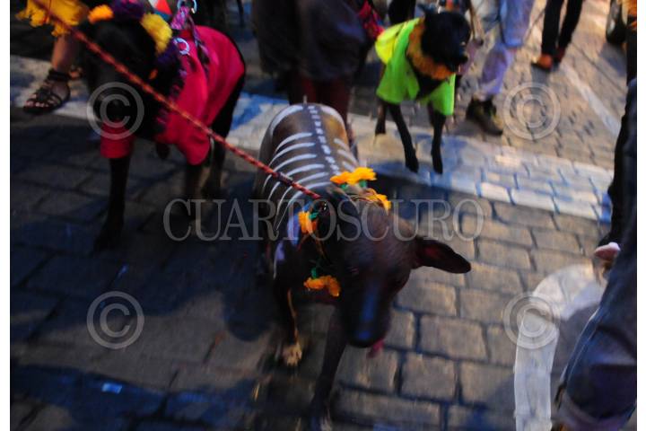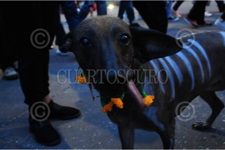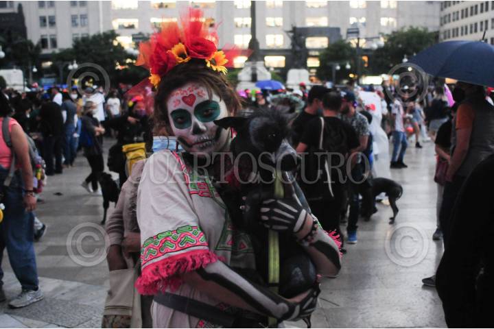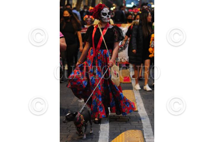 Una catrina avanza por las calles del Centro junto a su perro Xoloitzcuincle.