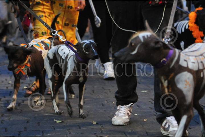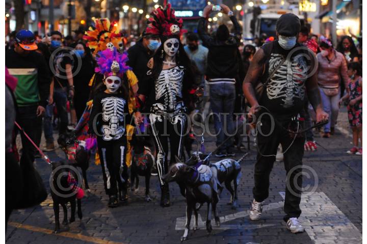 Una familia disfrazada de esqueletos avanzan con sus perros xoloitzcuincles.