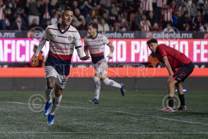 TIJUANA,, BAJA CALIFORNIA, 26ENERO2024.- Acciones del encuentro entre Xoloitzcuintles de Tijuana contra Chivas de Guadalajara, realizado en el estadio Caliente, como parte de la Jornada 3 del Torneo de Clausura de la Liga Mx. El marcador final fue de empate a un gol. En la imagen, Roberto Alvarado festeja el gol anotado. FOTO: OMAR MARTÍNEZ /CUARTOSCURO.COM