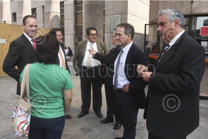 MÉXICO, D.F., 02MAYO2012.- Fernando Perfecto, Secretario general de la Asociación Sindical de Pilotos de Aviación junto a Ricardo del Valle, líder de sobrecargos de mexicana y Miguel Angel Yúdico, líder sindical de trabajadores de tierra de Mexicana a la salida de la reunión que tuvieron en la Sede del Poder Judicial de la Federación donde se definirá la situación de Mexicana. FOTO: ENRIQUE ORDÓÑEZ /CUARTOSCURO.COM