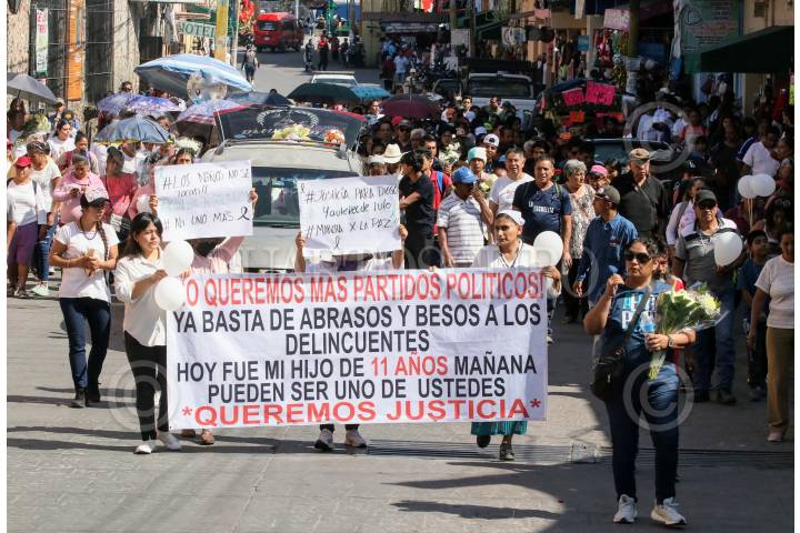 YAUTEPEC, MORELOS, 04DICIEMBRE2024.- Cortejo fúnebre del niño Diego de 11 años, alumno de sexto grado de la escuela primaria Miguel Hidalgo de este municipio. El niño murió luego de que fue herido por una bala pérdida, cuando acudió a comprar tortillas y quedó en medio de una balacera donde un hombre de 36 años fue asesinado. Vecinos, familiares, compañeros de escuela acompañaron el cortejo que recorrió las calles del municipio, llegando al zócalo donde el padre del niño lanzo un fuerte mensaje a la sociedad y gobernantes. FOTO: MARGARITO PÉREZ RETANA/CUARTOSCURO.COM