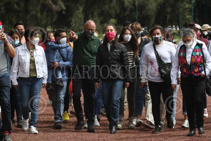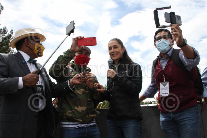 Claudia Sheinbaum, interactúa con youtubers durante recorrido a medios.