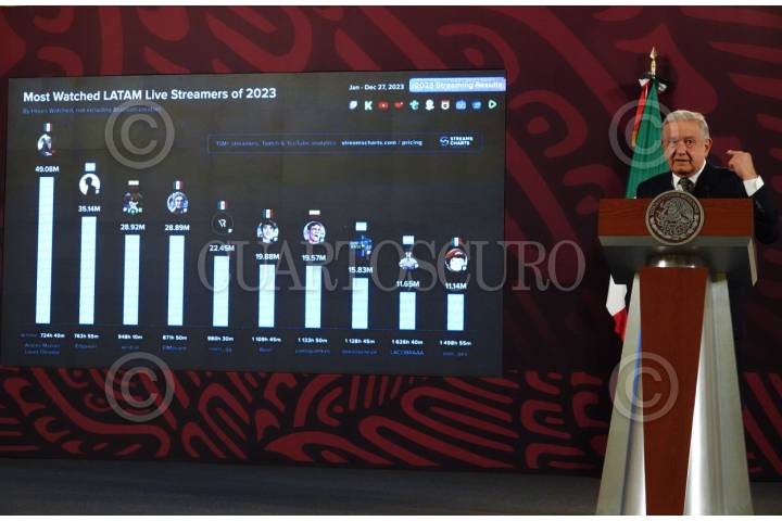 CIUDAD DE MÉXICO, 12ENERO2024.- Andrés Manuel López Obrador, presidente de México, encabezó la conferencia matutina desde Palacio Nacional, la cual fue dedicada a contestar las preguntas de los periodistas. En la foto muestra gráfica de los streamers más vistos del 2023. FOTO: DENISSE HERNÁNDEZ/CUARTOSCURO.COM