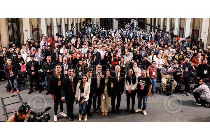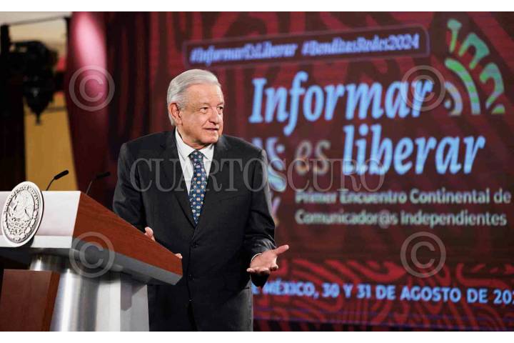 CIUDAD DE MÉXICO, 30AGOSTO2024.-Andrés Manuel López Obrador, presidente Constitucional de los Estados Unidos Mexicanos en inauguración del Primer Encuentro Continental de Comunicador@s Independientes: Informar es liberar. Lo acompañan Jesús Ramírez Cuevas, coordinador general de Comunicación Social y vocero del Gobierno de la República; Nancy Flores (México); Betiana Vargas (Argentina); Vicente Serrano (México); Manuel Pedrero (México) y Antonio Perales (EEUU). FOTO: PRESIDENCIA/CUARTOSCURO.COM