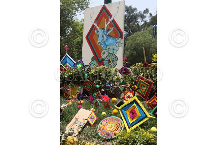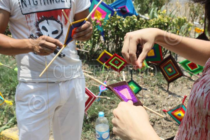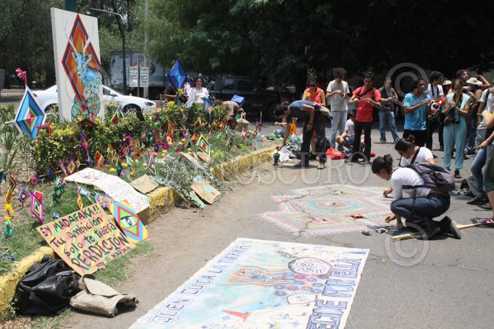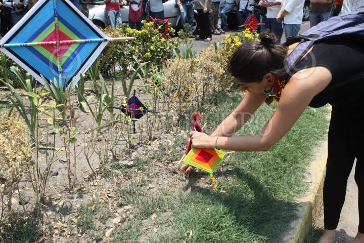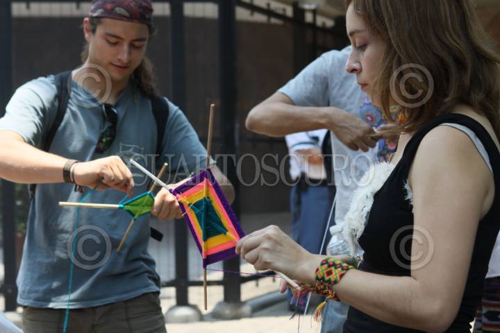 MÉXICO, D.F., 20MAYO2011.- Un grupo de activistas de diversas organizaciones civiles se manifestó frente a la Embajada de Canadá para exigir el retiro de las 22 concesiones que el gobierno mexicano le otorgó a la empresa First Majestic Silver, para explotar yacimientos de oro y plata en la zona sagrada de Wirikuta, en San Luis Potosí. Los participantes realizaron artesanías huicholes llamados "ojos de dios" como parte de su manifestación. FOTO: MOISÉS PABLO/CUARTOSCURO.COM