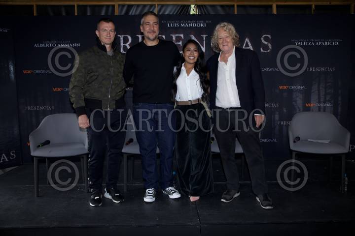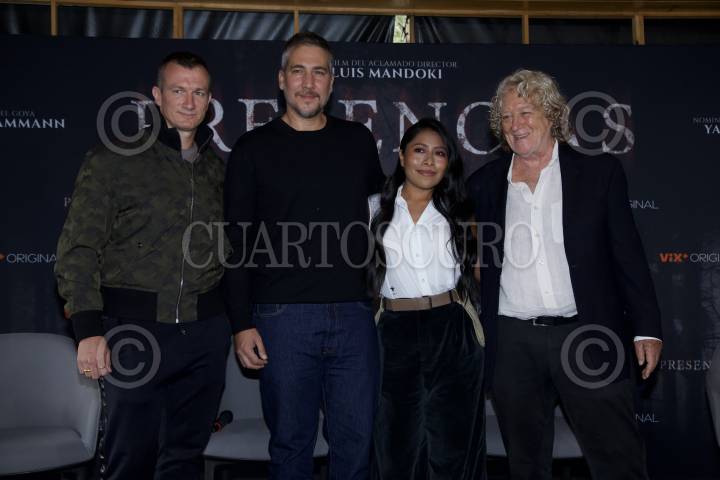Philip Lozano, Alberto Ammann, Yalitza Aparicio y Luis Mandoki durante la conferencia de prensa de la película Presencias en la Cineteca Nacional.