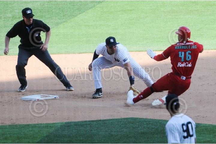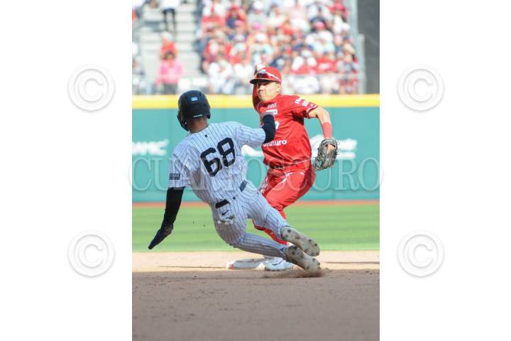 CIUDAD DE MÉXICO, 24MARZO2024.- Carlos Sepulveda, de los Diablos Rojos del México, elimina del juego a Cole Gabrielson, de los Yankees. FOTO: DANIEL AUGUSTO /CUARTOSCURO.COM