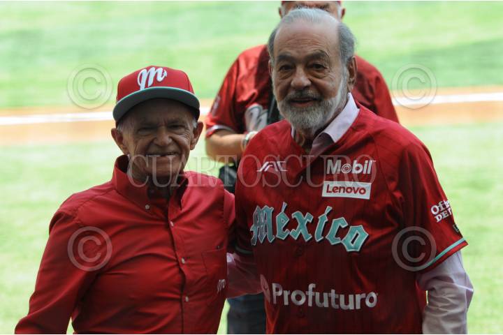 CIUDAD DE MÉXICO, 24MARZO2024.- Alfredo Harp Helú y Carlos Slim, se toman una fotografía previo al inicio del juego entre Diablos Rojos del México y los Yankees de Nueva York. FOTO: DANIEL AUGUSTO /CUARTOSCURO.COM