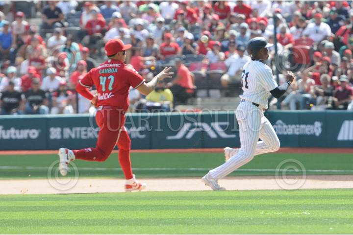 CIUDAD DE MÉXICO, 24MARZO2024.- Greg Allen, de los Yankees, es perseguido por Juan Carlos Gamboa dursnte el juego entre ambas escuadras. FOTO: DANIEL AUGUSTO /CUARTOSCURO.COM