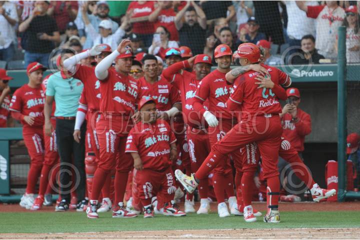 CIUDAD DE MÉXICO, 25MARZO2024.- Diosbel Arias, celebra con sus compañeros de los Diablos Rojos luego de conectar un home run con el que le dieron la vuelta al marcador contra los Yankees. FOTO: DANIEL AUGUSTO/ CUARTOSCURO.COM