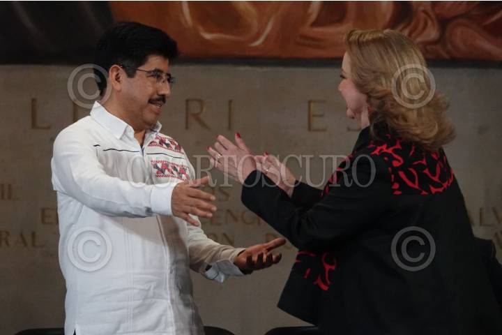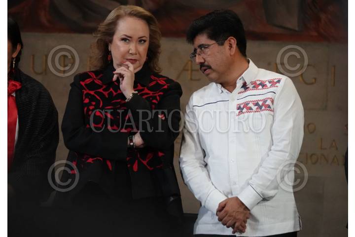 CIUDAD DE MÉXICO, 10SEPTIEMBRE2025.- Hugo Aguilar Ortiz, ministro presidente de la Suprema Corte de Justicia de la Nación, y la ministra Yasmín Esquivel Mossa durante la realización del Espacio de Diálogo de los Saberes: Las Mujeres Indígenas y Afromexicanas en la Nueva SCJN en la sede central del Poder Judicial. FOTO: GALO CAÑAS/CUARTOSCURO.COM