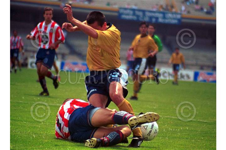 El delantero de Pumas Julio Cesar Yegros, pelea un balon en el area chica de Chivas. Pumas y Guadalajara empataron a cero goles este medio dia en Ciudad Universitaria. FOTO: Fernanda Sánchez/CUARTOSCURO.COM