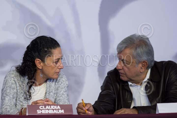 CIUDAD DE MÉXICO, 19AGOSTO2018.- Claudia Sheinbaum, jefa de gobierno electa de la Ciudad de México, y Andrés Manuel López Obrador, presidente electo de la República, durante el 5to Congreso Nacional Extraordinario del partido Movimiento de Regeneración Nacional (MORENA), en las inmediaciones del Deportivo Reynosa de la Delegación Azcapotzalco. El futuro presidente declaró que se estima que a mitad del sexenio nuestro país deje de comprar la gasolina al extranjero, así como la creación de una escuela de educación política al interior del partido. FOTO: GALO CAÑAS /CUARTOSCURO.COM