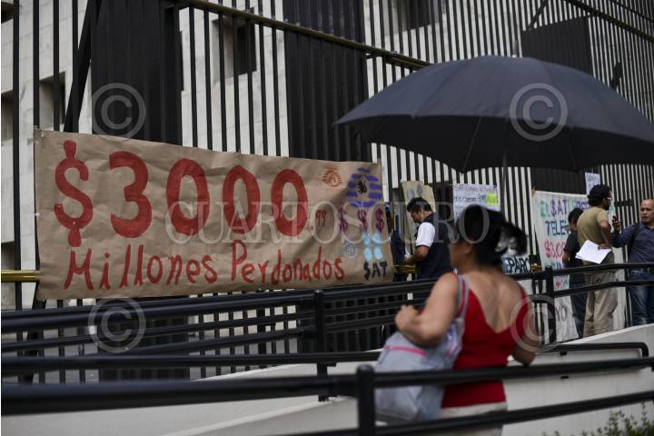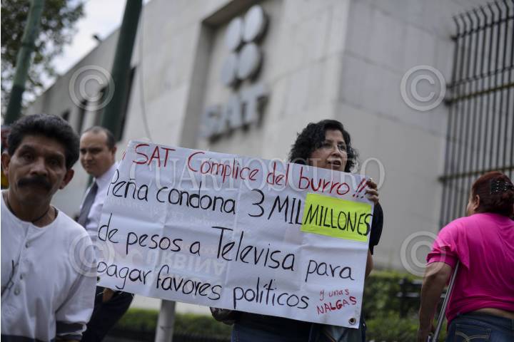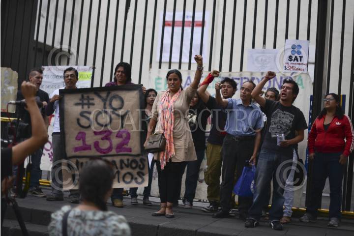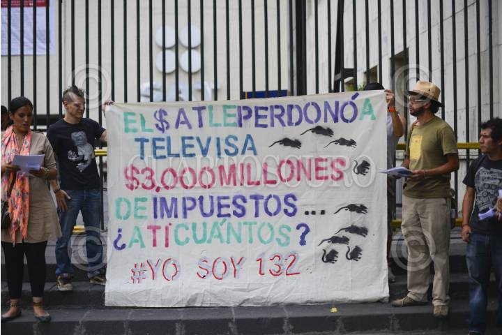 MÉXICO, D.F., 20MAYO2013.- Integrantes del movimiento estudiantil #Yo soy 132 realizaron una manifestación en la puerta principal del Servicio de Administración Tributaria (SAT) de la Secretaría de Hacienda y Crédito Público (SHPC), en protesta por la condonación de 3 mil de pesos aproximadamente en adeudos fiscales del Grupo Televisa. FOTO: ADOLFO VALTIERRA /CUARTOSCURO.COM