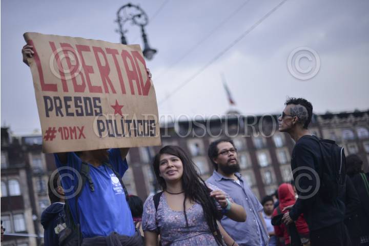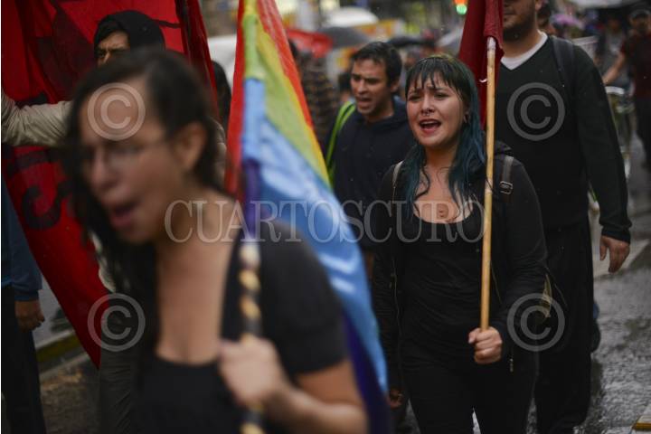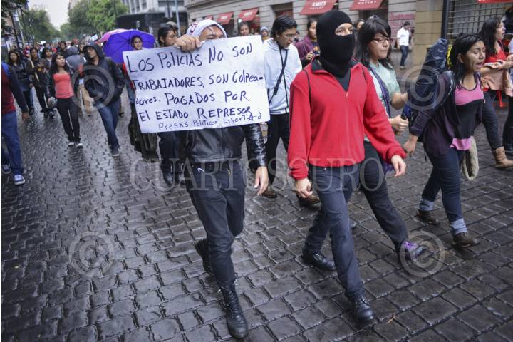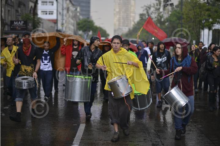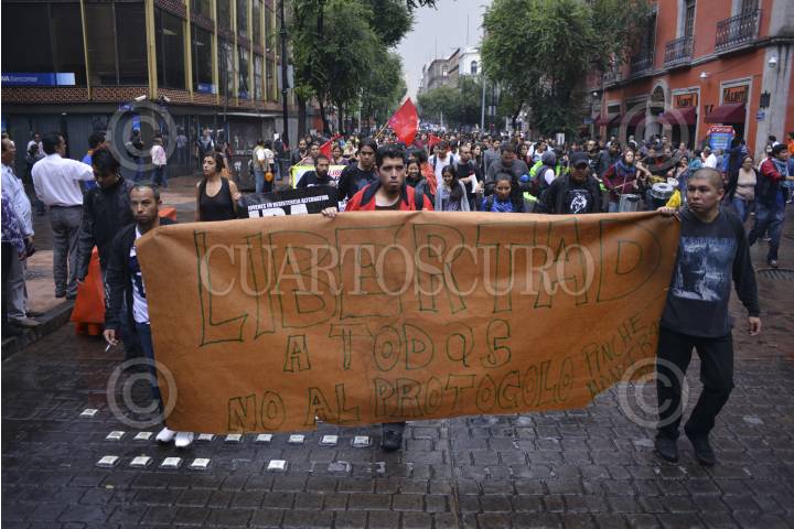 MÉXICO, D.F., 11JUNIO2013.- Jóvenes estudiantes de diferentes Universidades, Organizaciones Sociales, Feministas y Anarquistas; se manifestaron con una marcha en demanda de la liberación de las 22 personas detenidas por la policía capitalina el pasado 10 de junio durante la marcha por el 22 aniversario del halconazo. A pesar de la intensa lluvia y del acompañamiento de granaderos, los manifestantes partieron de la Agencia 50 de la Procuraduría General de Justicia del DF al Zócalo capitalino, en donde terminó con la participaron madres y padres de los jóvenes detenidos. FOTO: ADOLFO VALTIERRA /CUARTOSCURO.COM