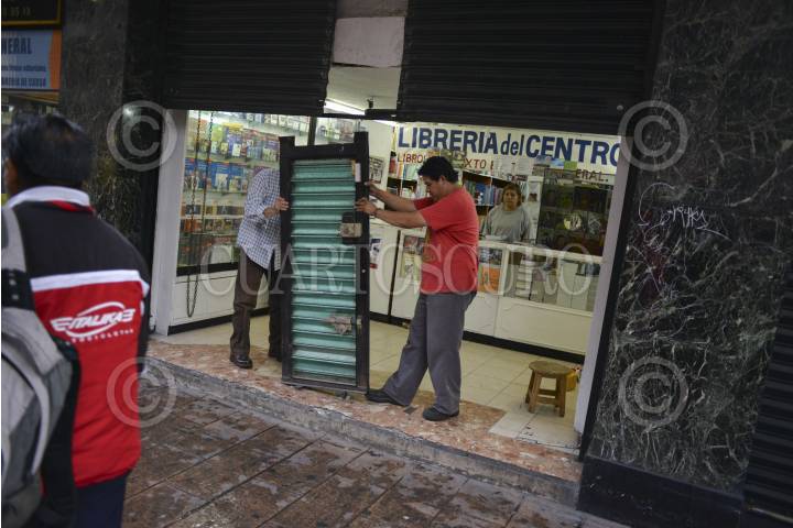 MÉXICO, D.F., 11JUNIO2013.- Jóvenes estudiantes de diferentes Universidades, Organizaciones Sociales, Feministas y Anarquistas; se manifestaron con una marcha en demanda de la liberación de las 22 personas detenidas por la policía capitalina el pasado 10 de junio durante la marcha por el 22 aniversario del halconazo. A pesar de la intensa lluvia y del acompañamiento de granaderos, los manifestantes partieron de la Agencia 50 de la Procuraduría General de Justicia del DF al Zócalo capitalino, en donde terminó con la participaron madres y padres de los jóvenes detenidos. En la imagen, comerciantes cierran tiendas durante el paso de la manifestación por temor a enfrentamientos. FOTO: ADOLFO VALTIERRA /CUARTOSCURO.COM