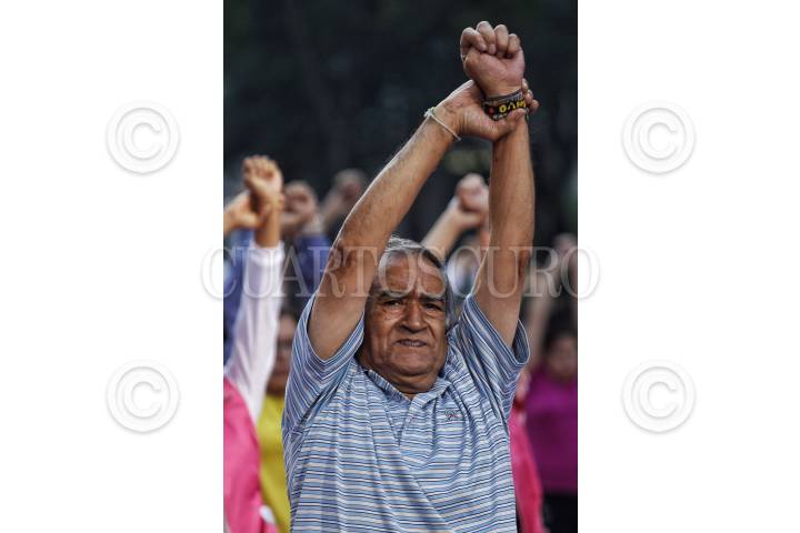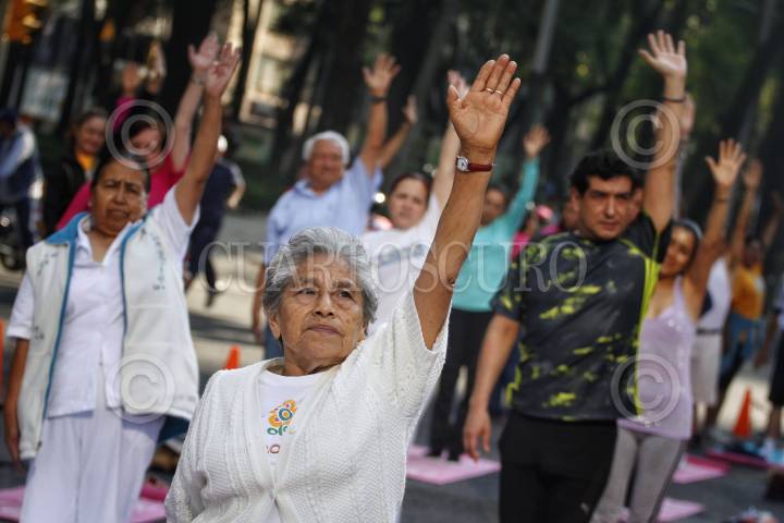 MÉXICO, D.F., 26ABRIL2015.- Decenas de personas, de todas las edades, participaron en la clase msiva de Yoga, que se realizó en la glorieta de la Palma, sobre Paseo de la Reforma. FOTO: ISAAC ESQUIVEL /CUARTOSCURO.COM