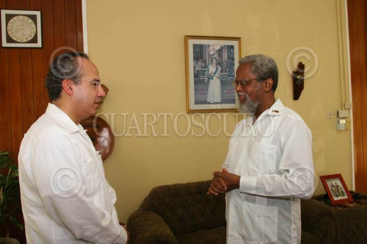 BELMOPAN, BELICE. 30JUNIO2007.- Felipe Calderón Hinojosa, presidente de México durante la reunión con Sir. Colville Young, gobernador general de Belice, que tuvo ligar en la casa Belice. FOTO: ALFREDO GUERRERO/CUARTOSCURO.COM