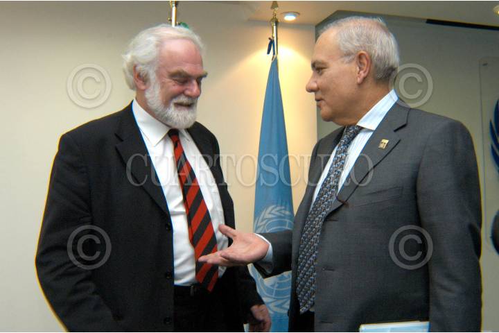 MÈXICO D.F. 09 MARZO.2006- Gordon Young, Coordinador Mundial de Evaluación de los Recursos Hídricos de la ONU (WWAP) junto con Cristóbal Jaime Jáquez, director general de la Comisión Nacional del Agua, durante la presentación mundial del 2o. Informe Civico Sobre el Desarrollo de Recursos Hídricos, en las intalaciones de la ONU en México. FOTO:Guillermo Perea / CUARTOSCURO.COM