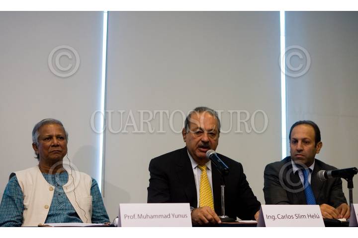 MÉXICO, D.F., 29SEPTIEMBRE2008.- Muhammad Yunus, Premio Nobel de la Paz 2006, Carlos Slim Helú, fundador del grupo CARSO y Marco Antonio Slim Domit, ofrecieron una conferencia de prensa en la cual hablaron sonre una alianza para la entrega de microcréditos a los habitantes de regiones marginadas en México y en futuro posiblemente de América Latina. La Fundación Carlos Slim se unió a Grameen Trust del bangladés Yunus para crear Grameen-Carso que contará con un capital inicial de cinco millones de dólares, aportado por el empresario mexicano, y garantizará otros 40 millones de dólares para otorgar al menos 80.000 microcréditos a tasa fija.El empresario señaló que se seguirá en México el modelo Banco Grameen desarrollado por Yunus en Bangladesh, a partir del cual se presta a la gente sin las garantías tradicionales que solicita la banca comercial. FOTO: ALBERTO VERA/CUARTOSCURO.COM