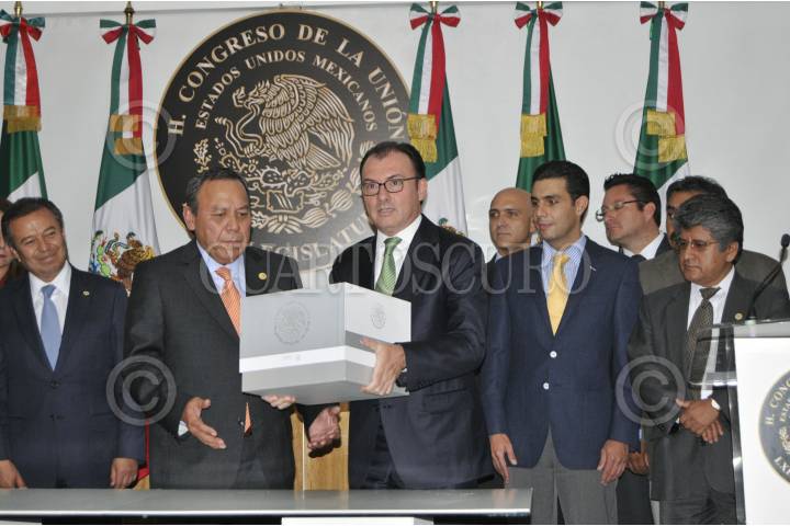 MÉXICO D.F. 08SEPTIEMBRE2015.- Luis Videgaray Caso, Secretario de Hacienda y Crédito Público, entregó el paquete económico de la federación para el ejercicio fiscal 2016 al presidente de la mesa directiva de la Cámara de Diputados, Jesús Zambrano Grijalba en el salón de protocolo del Congreso de la Unión. FOTO SAÚL LOPEZ /CUARTOSCURO.COM