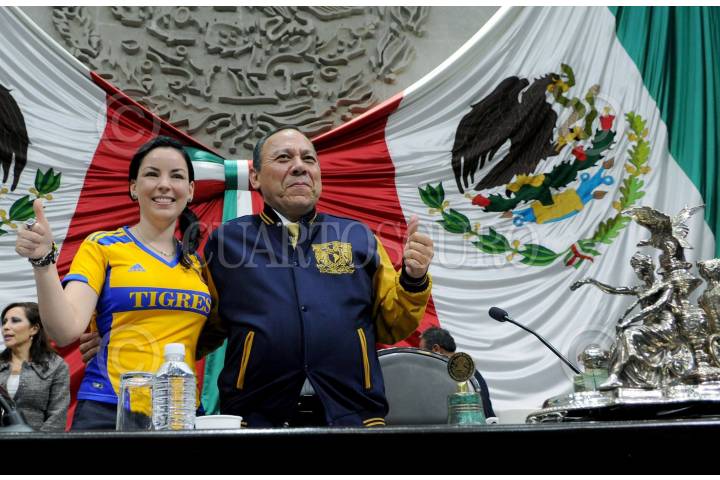 MÉXICO, D.F., 10 DICIEMBRE 2015.- La diputada del PAN, Brenda Velázquez lució una playera de los tigres acompañada de Jesús Zambrano quien portaba una chamarra de la UNAM, durante la sesión ordinaria en la Cámara de Diputados. FOTO: CUARTOSCURO.COM