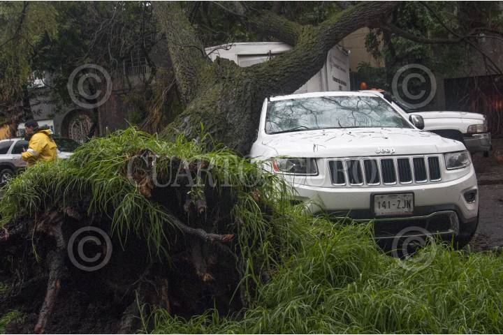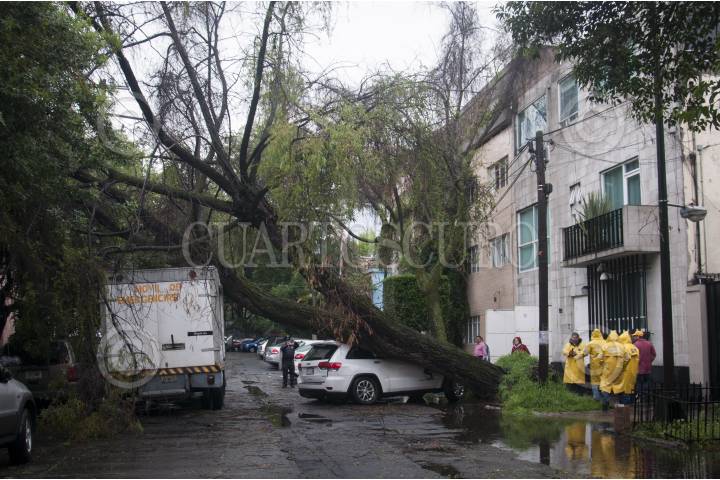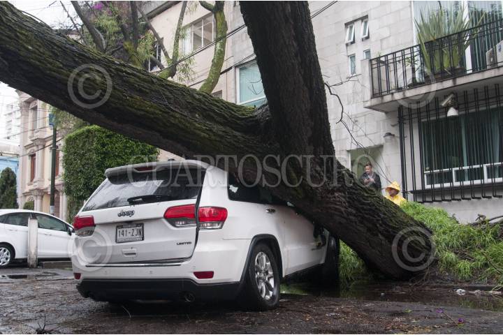 MÉXICO, D.F., 29MAYO2015.- La fuerte lluvia y el intenso viento provocó que de nueva cuenta se cayera un árbol en la colonia Condesa, esta vez en la calle de Zamora casi esquina con Francisco Márquez. Bomberos acudieron a quitar el árbol que mide más de 20 metros y bloqueo toda la calle. FOTO: DIEGO SIMÓN SÁNCHEZ /CUARTOSCURO.COM