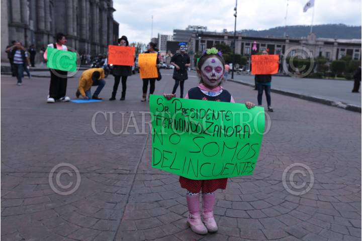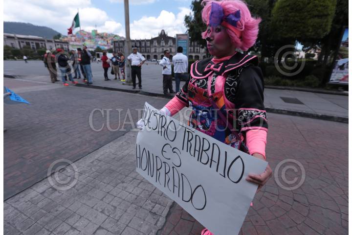 TOLUCA, ESTADO DE MÉXICO, 13OCTUBRE2017.- Pinta caritas que habitualmente trabajan los fines de semana en la Concha Acústica y la Plaza González Arratia se manifestaron frente al palacio municipal de Toluca, exigiendo los deje trabajar el alcalde Fernando Zamora, ya que son acosados por inspectores del ayuntamiento; bloquearon por algunas horas la avenida Independencia. FOTO: ARTEMIO GUERRA BAZ / CUARTOSCURO.COM