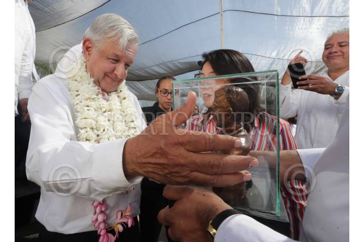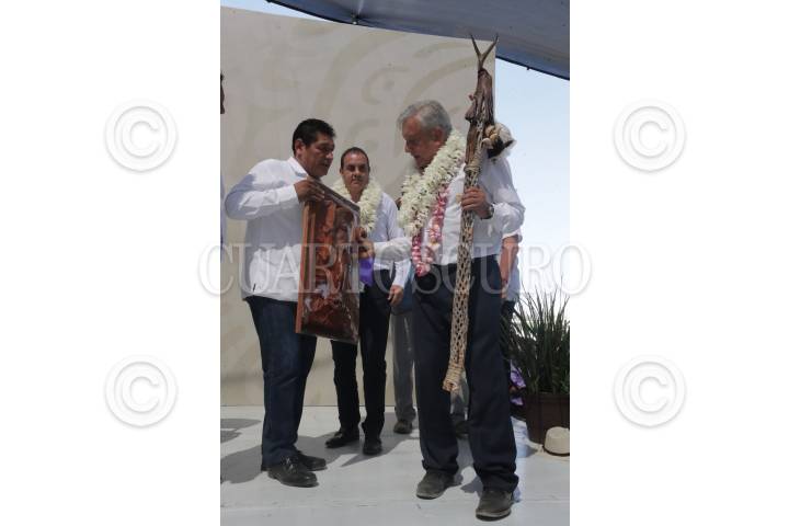 CUAUTLA, MORELOS, 10FEBRERO2019.- Andrés Manuel López Obrador, Presidente de México, durante la presentación de la propuesta del Gobierno Federal para la construcción de la Planta Termoeléctrica en Huexca. Durante el evento le entregaron un bastón de mando y artesanías representativas de Emiliano Zapata, el llamado Caudillo del Sur. FOTO: GOBIERNO DE LA REPÚBLICA /CUARTOSCURO.COM